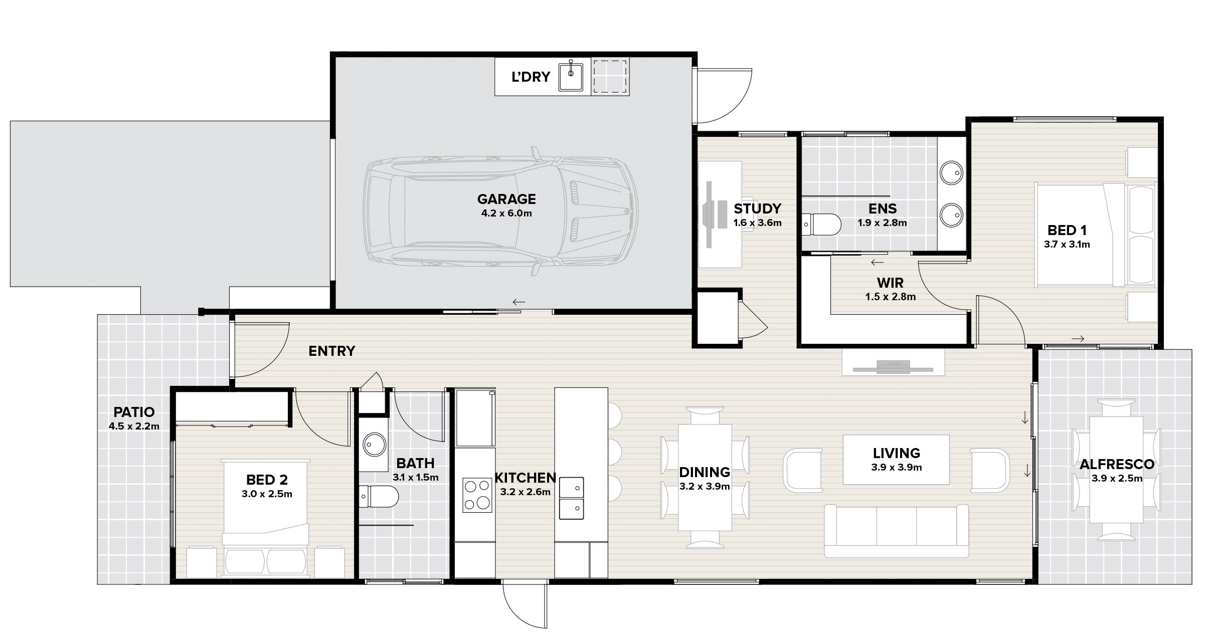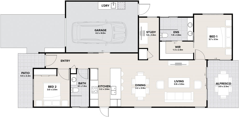 Artist impression. Not to scale and subject to change and approvals. This manufactured home is regulated under the Manufactured Homes (Residential Parks) Act 2003. Refer to the comparison document here.